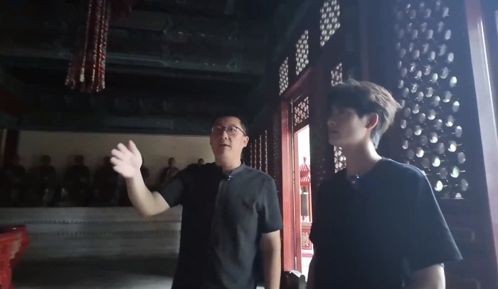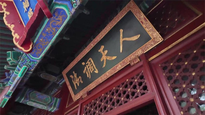 步入法轮殿,殿内匾额 “人天调御”成为解读皇家思想的关键。徐老师指出:匾额背后是乾隆“政教合一”的治国理念。 殿顶 “聚锦琉璃瓦”与 “五脊六兽”,更彰显皇家寺庙的专属等级。上行至 “龙光紫照牌楼”,徐老师介绍其等级体系:“最高等级为琉璃质,其次是石质,最低为木质,这座牌楼虽体量不大,却以‘龙光’‘紫照’的寓意,传递出皇家对祥瑞的追求。”